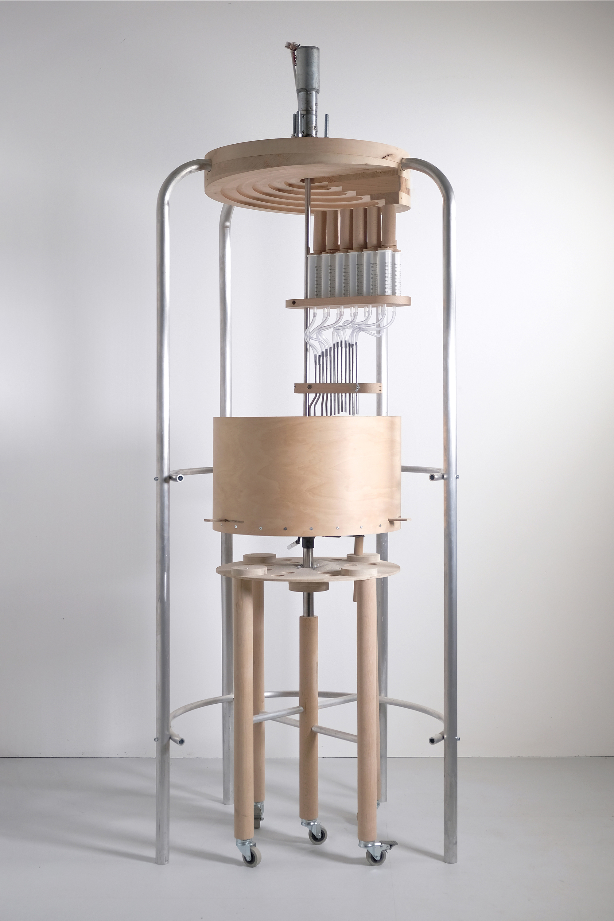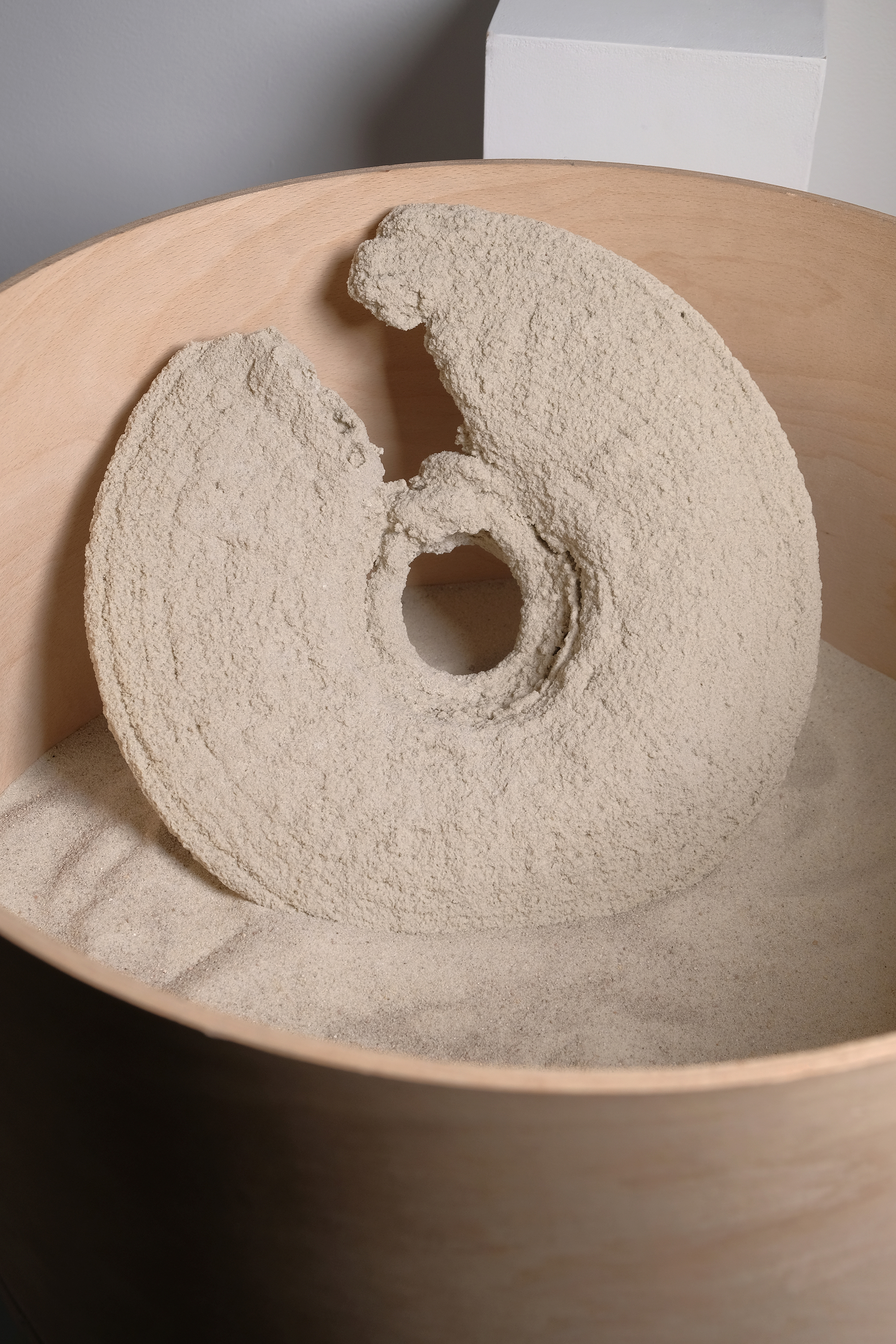 The machine produces rotationally symmetrical ruin-like vessels out of sand. Syringes are used to inject the liquid potassium silicate into the sand. Potassium silicate is a liquid derived from silicon that silicifies sand, that „ sticks“ it together. Carbon- dioxide from the air around hardens the liquid, thus creating vessels of limited lifetime that have a ruin-like appearance.